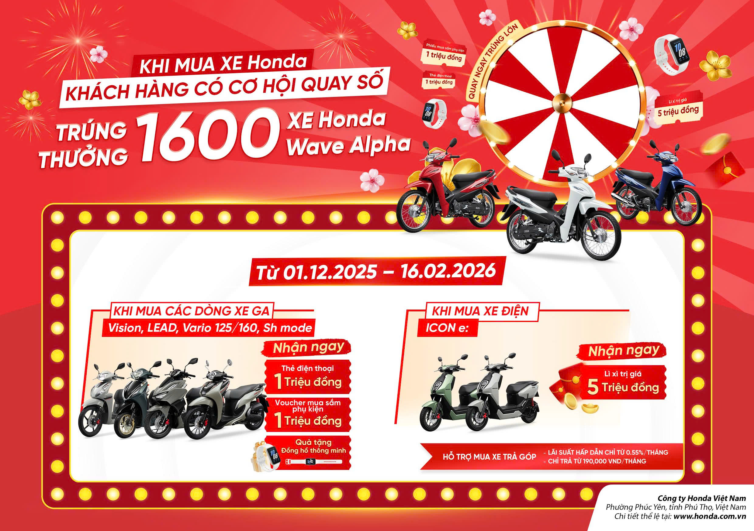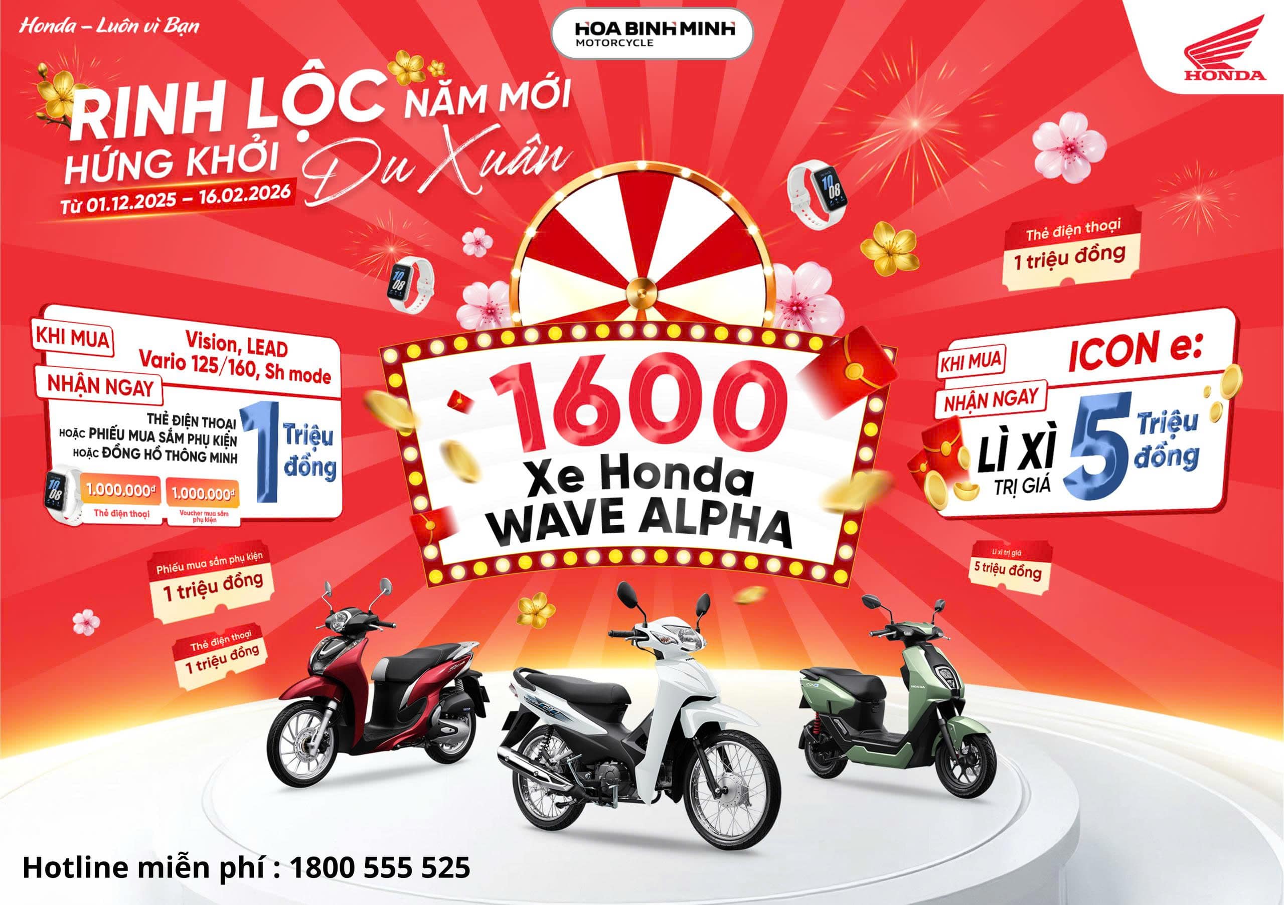 Đón Tết tưng bừng cùng Xe máy Hòa Bình Minh! Từ 01/12/2025 đến 16/02/2026, khi mua các mẫu xe Honda được áp dụng chương trình tại HEAD và cửa hàng bán xe tổng hợp, bạn sẽ có cơ hội tham gia quay số trúng thưởng, nhận quà tặng trực tiếp hoặc hưởng chương trình trả góp lãi suất thấp. Nhanh tay rinh lộc năm mới — quà nhiều, ưu đãi lớn, lái xe an toàn suốt năm!